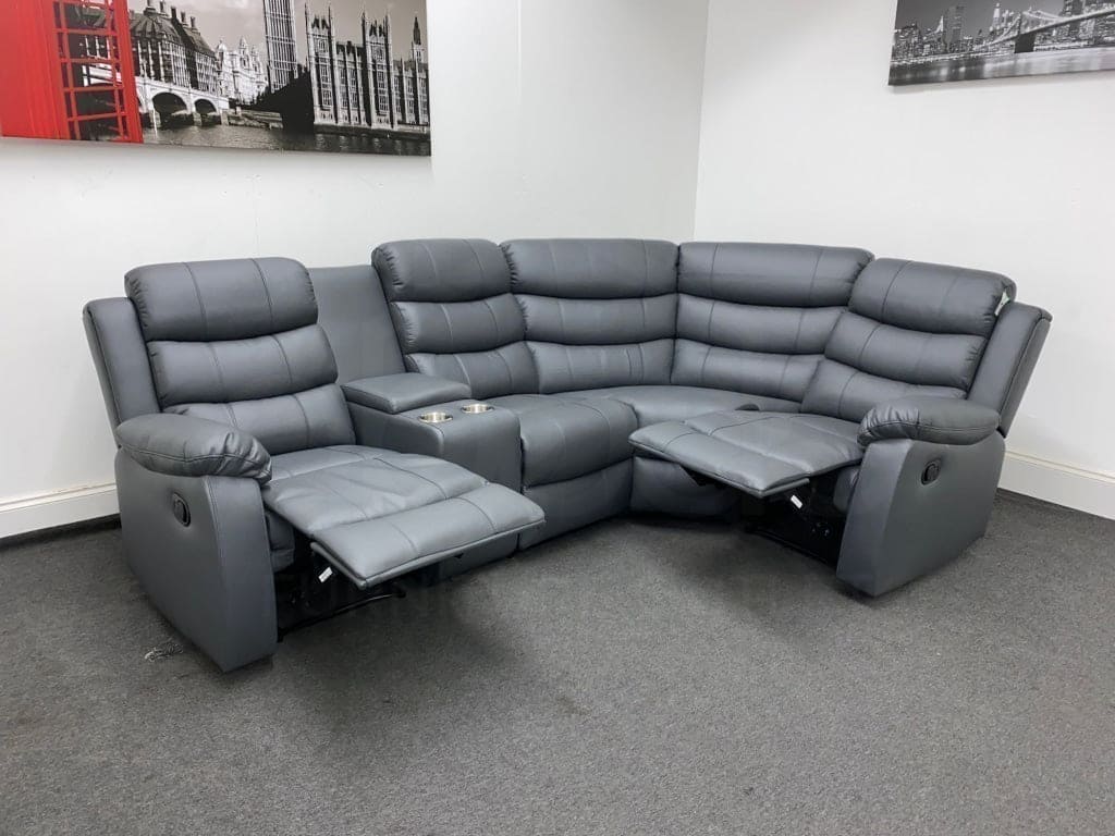 Lando RHF Modular Manual Recliner Grey Leather Corner Sofa with Drinks Console
