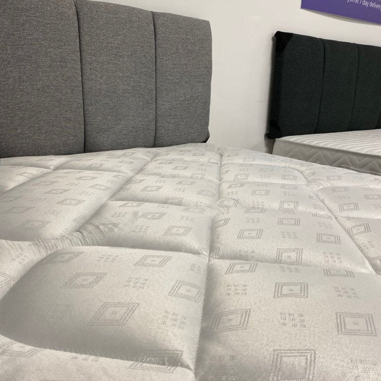 Included in this package is a 2 draw divan bed base in Grey fabric, a headboard in Grey fabric & the Mattress. The Complete Set.